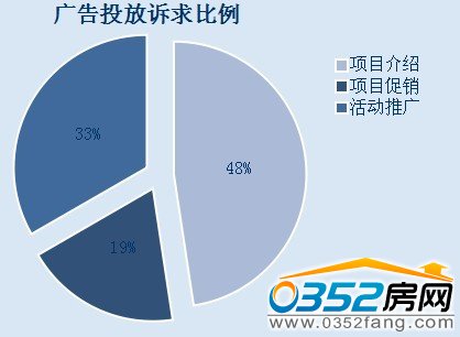 廣告中,訴求點是關(guān)鍵內(nèi)容,在此次統(tǒng)計中,有半數(shù)多的樓盤投放信息是相關(guān)的項目介紹,其次是開發(fā)公司推廣活動,而其中項目銷售也占一部分,這也和項目具體的銷售節(jié)點有關(guān)。